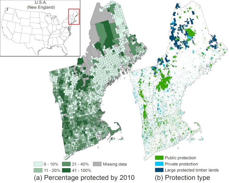 This article has been updated with a higher-resolution version of the map depicting land protection across New England.