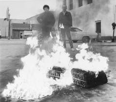 United States Army draft cards set ablaze in protest in Los Angeles, May 1969.AP Photo