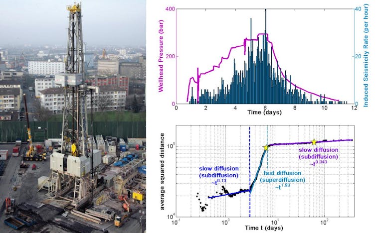 The above figure shows that as fluid pressure at the top of the well Basel 1 (purple line) was increasing during injection, the induced seismicity rate also increased (bluish bars). In the bottom figure, the average squared distance of the induced earthquakes from the well is shown, which indicates the complex propagation of seismicity away from the well over time. The largest-earthquakes (magnitude greater than 3, shown with stars) occurred after the injection ended.